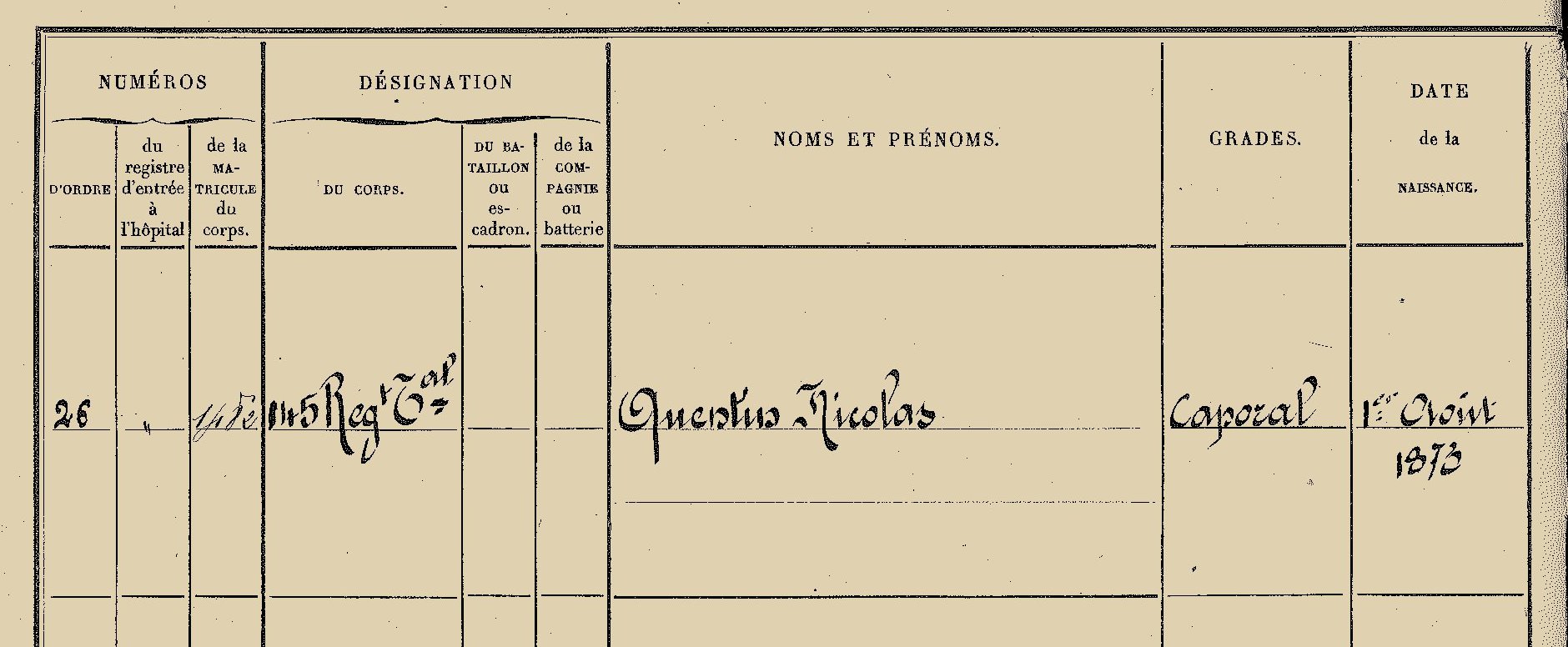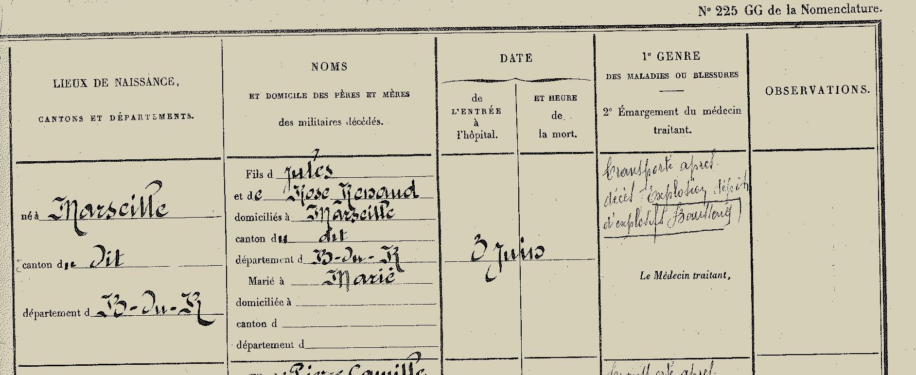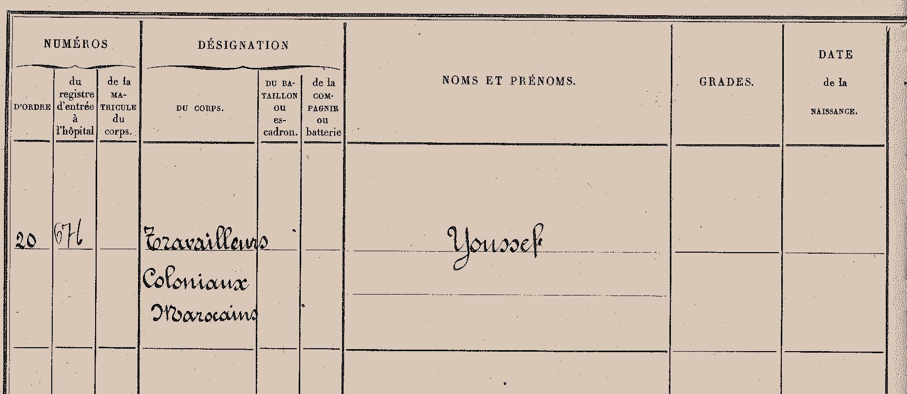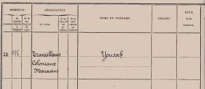 Arch. com. d’Arles, 1S729b: Registres des hôpitaux, exemples d’admission d’un travailleur colonial marocain et d’un soldat du 145e régiment territorial morts dans l’explosion du dépôt de munitions de Beaussenq