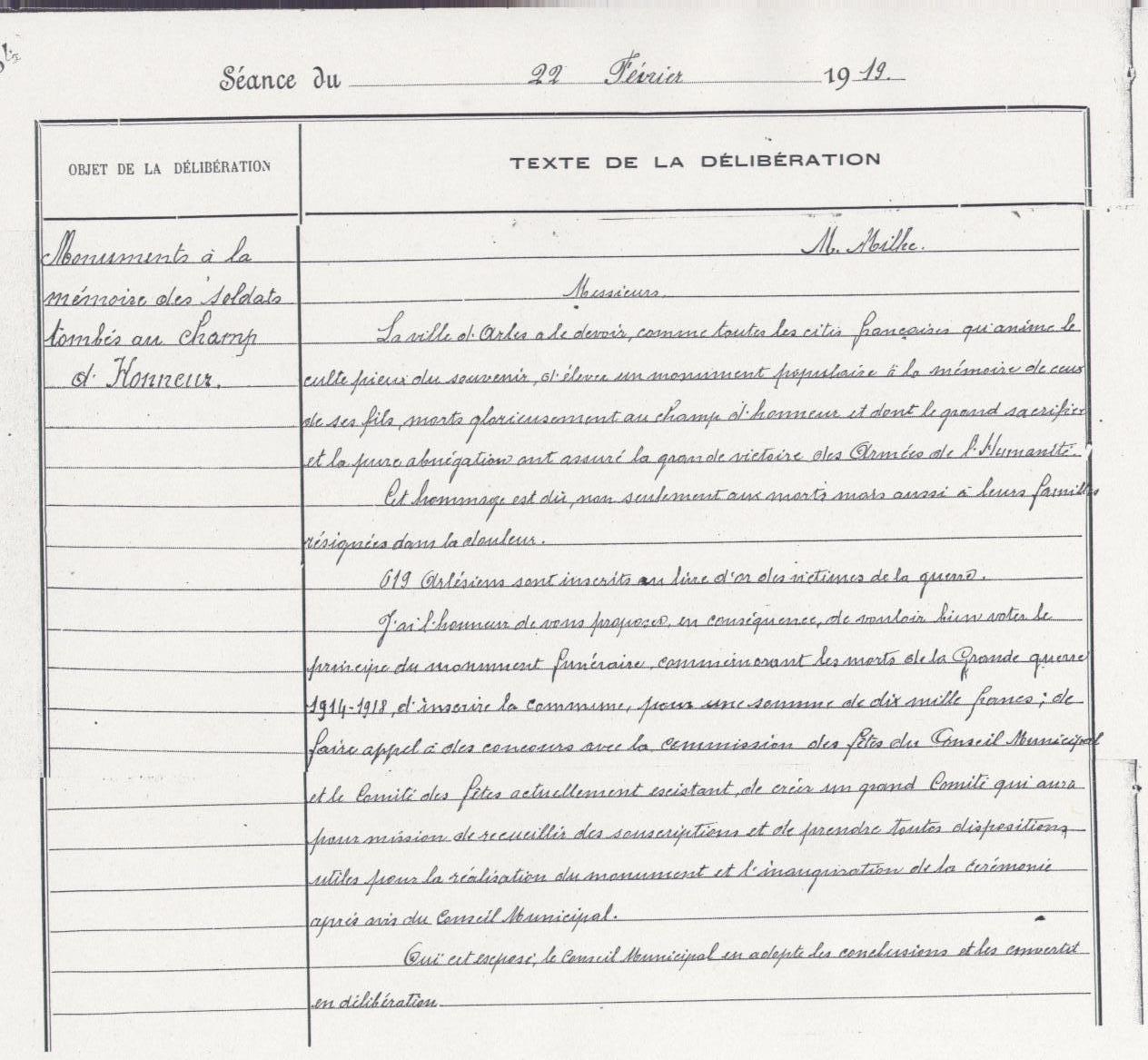 Arch. com. Arles, D43 p133-134, délibération de la ville d’Arles du 22 février 1919 concernant l’érection d’un monument des soldats tombés au champ d’honneur »