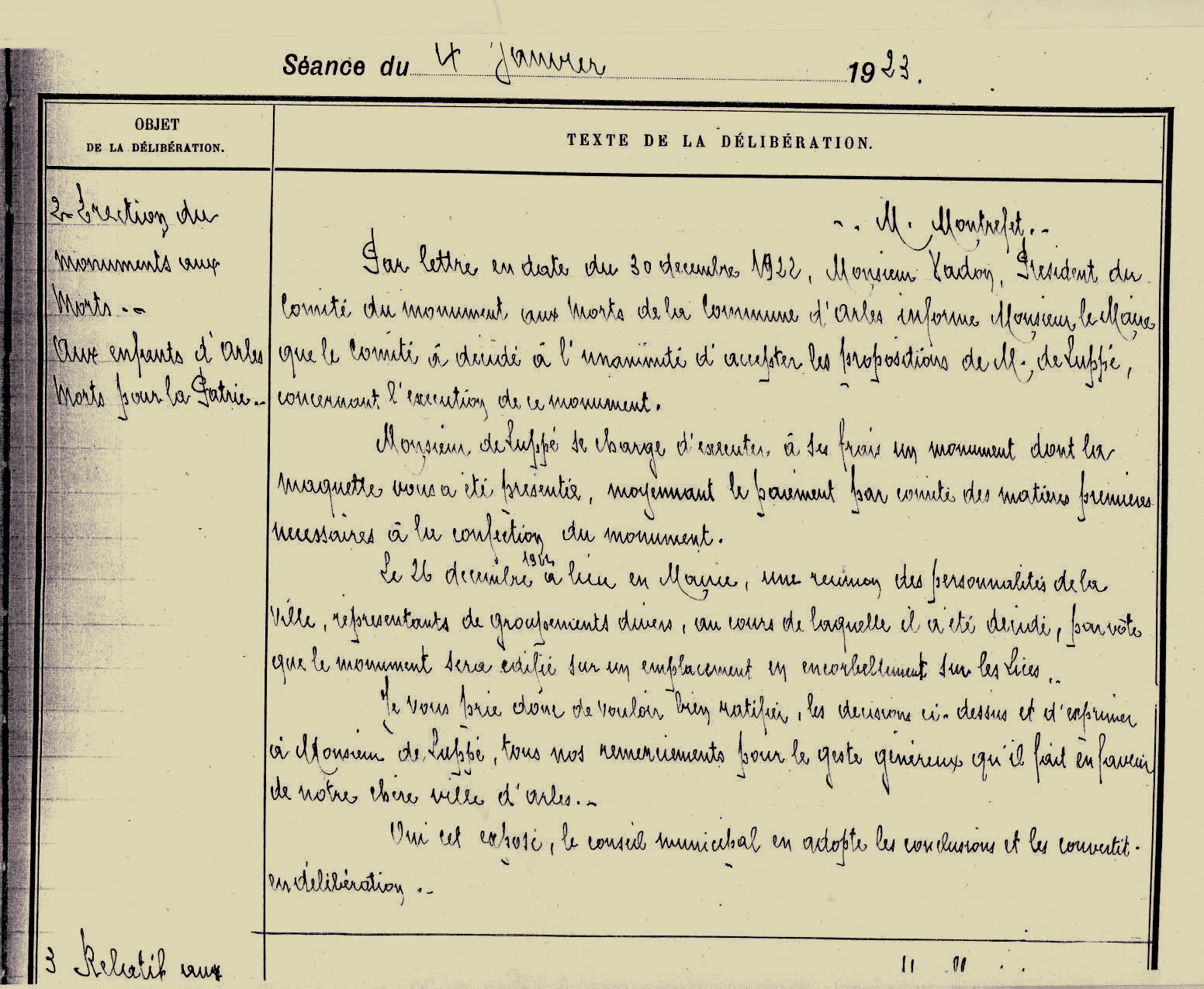 Arch. com. Arles, D 45 p221, Délibération de la ville d’Arles du 4 janvier 1923 concernant l’érection d’un monument aux morts, « Aux enfants d’Arles morts pour la patrie ».