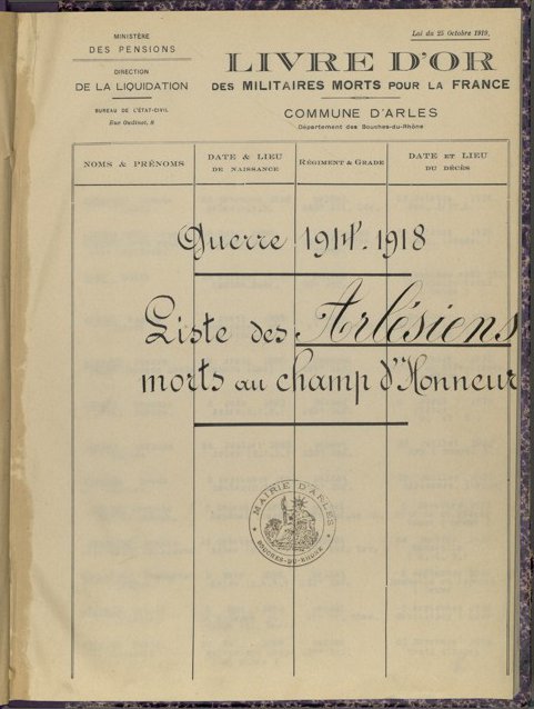 Cette délibération fait référence au livre d’Or des Arlésiens morts pour la France durant la Première Guerre mondiale qui recense les 619 soldats « tombés au champ d’Honneur » pour défendre la patrie. Ce livre donne l’identité de chaque soldat, la date et le lieu de naissance, le régiment et le grade ainsi que la date et le lieu de la mort.