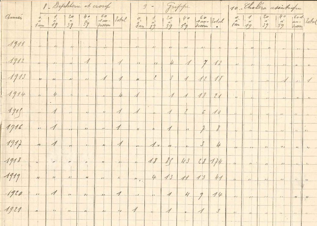 A Arles, comme dans le reste de la France, c’est fin juillet que le virus est le plus virulent. Les hôpitaux sont submergés, on manque de lits pour accueillir les malades, de médicaments, de linge, de matériels. Les patients attendent parfois trois jours pour être hospitalisés. Les pharmaciens manquent de quinine, d’aspirine et surtout de rhum, très prisé des patients comme stimulant. La surmortalité est alarmante, les registres des hôpitaux arlésiens recensent les malades affectés par la grippe espagnole. Ils comptent 174 victimes pour l’année 1918 dont la plupart sont de jeunes adultes (voir ci-dessous, le tableau statistique du bureau d’hygiène des décès par causes et tranche d’âge).
