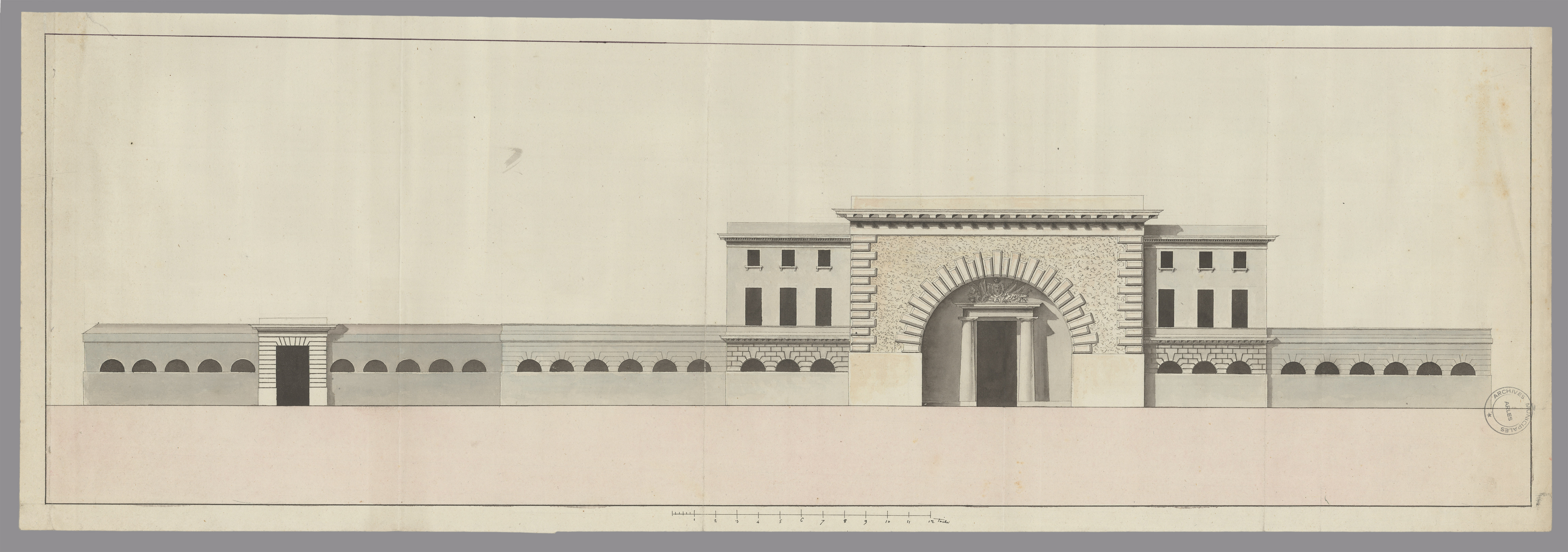 Élévation de la façade de la maison des révérends pères Jésuites du collège de la ville d’Arles.Projet de J.B Perre, Maître menuisier Dessin aquarellé sur papier – 48,5 x 32,5 – éch. 6 cannes