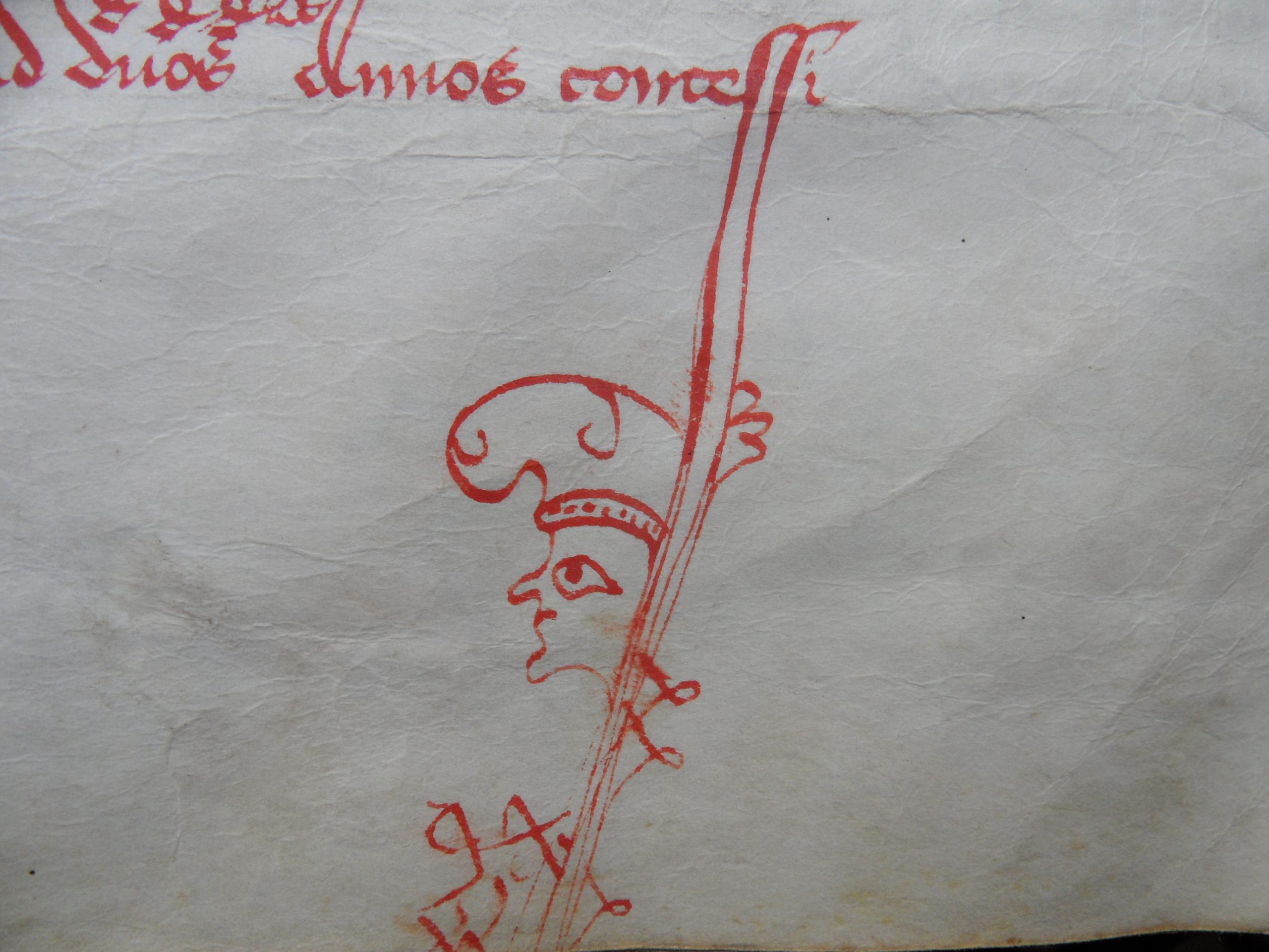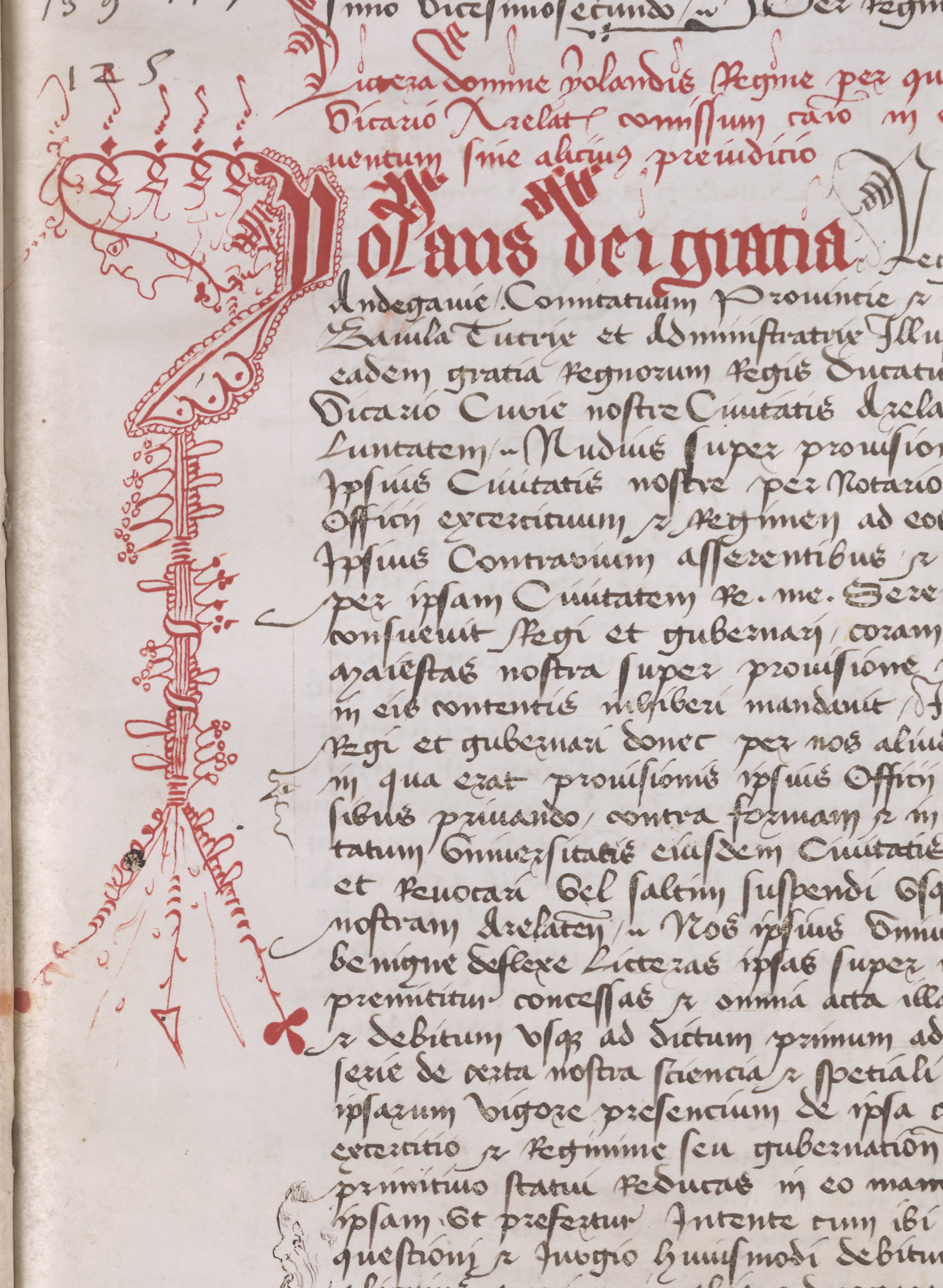 AA7 folio 24 recto : En-tête d’une lettre de la comtesse de Provence Yolande d’Aragon (1400-1417, dcd en 1442) datant de 1419 et recopiée dans le cartulaire, ornée d’une grande lettrine à l’encre rouge avec grotesque. En bas, le long du texte apparaît un masque de théâtre