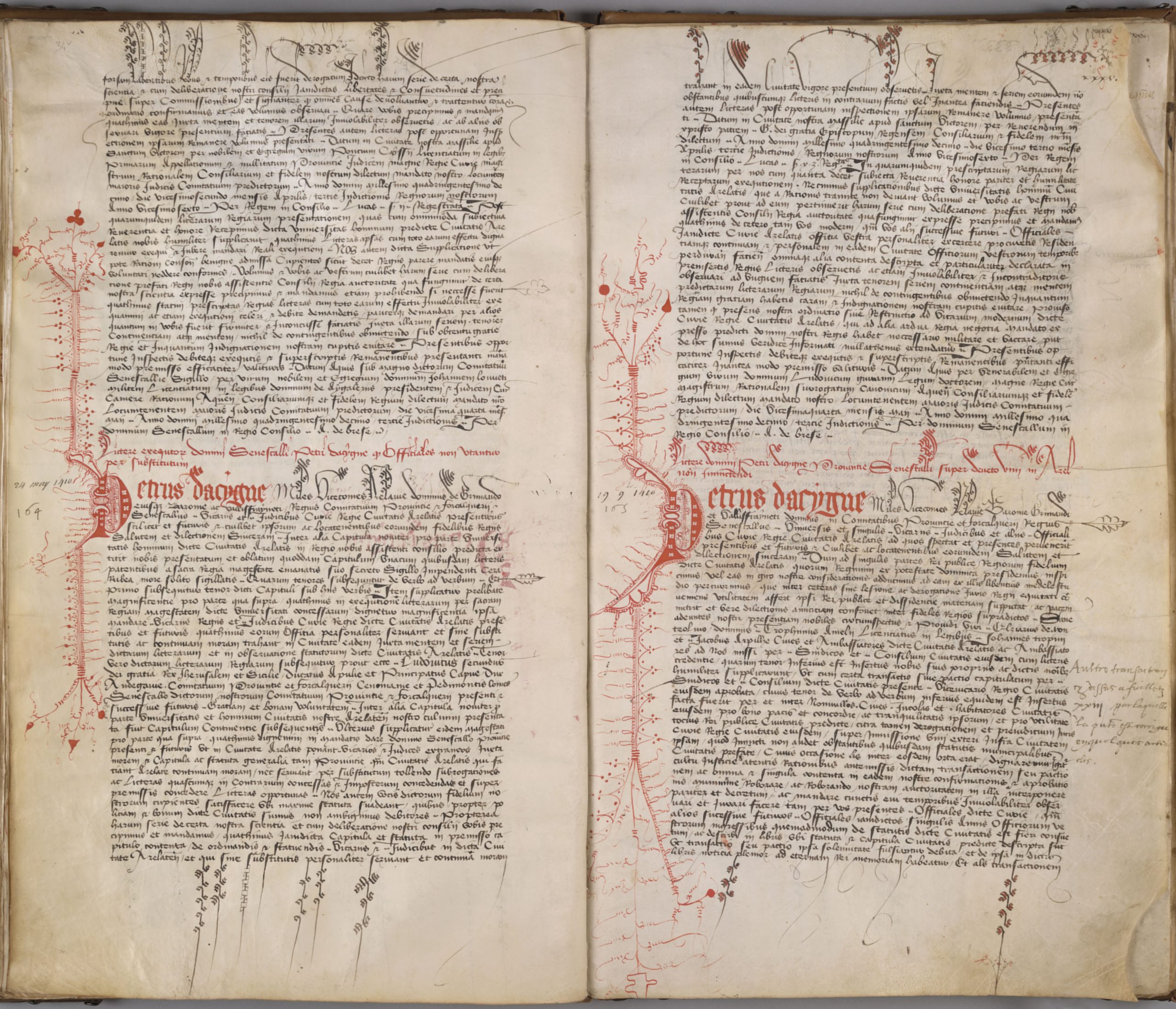 AA7 folios 34 verso et 35 recto : Lettres du sénéchal de Provence Pierre d’Acigné (1405-1423) datant de 1410, montrant la richesse et le soin apportés au décor notamment à la lettrine P