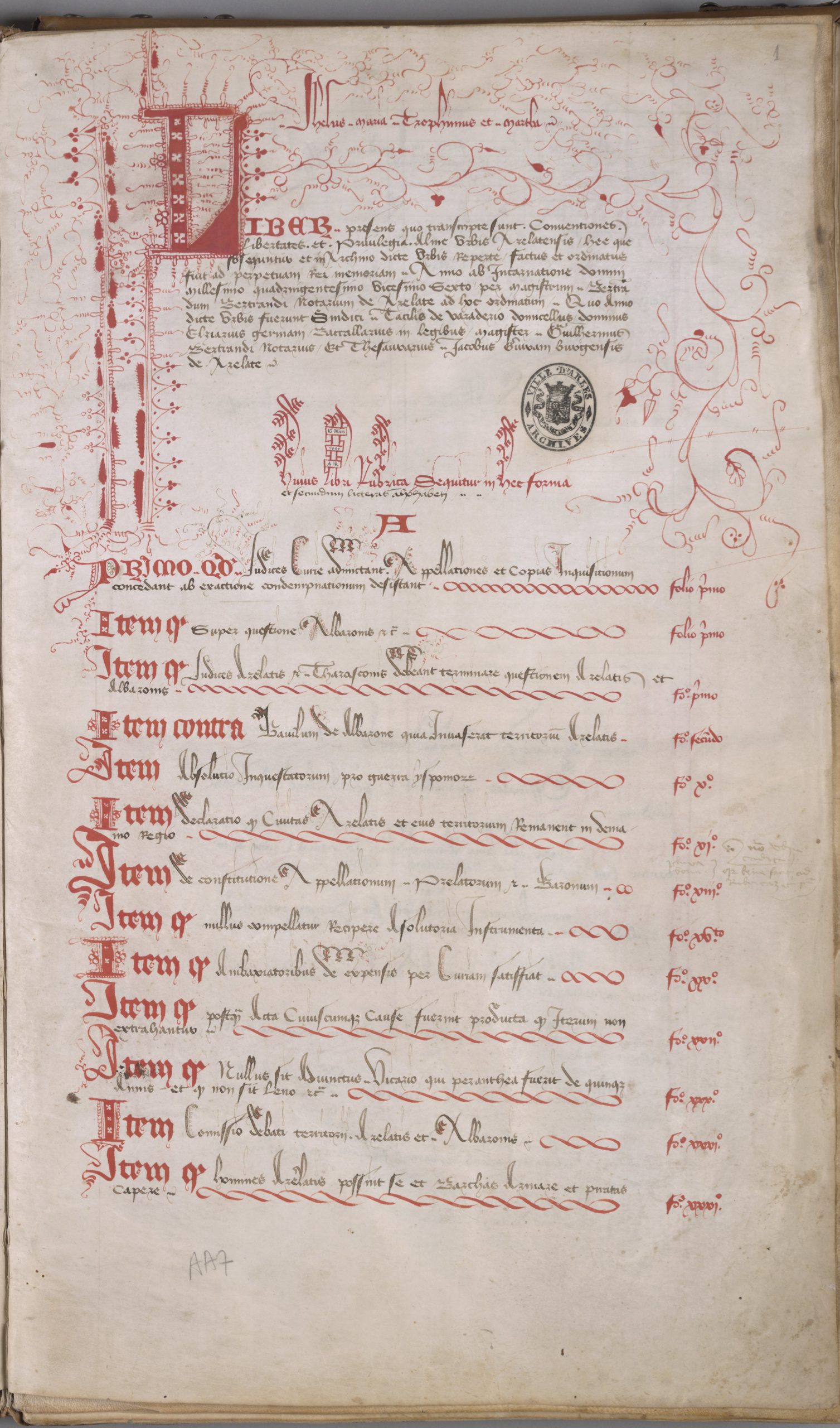 Le document, rédigé en latin par un notaire de l’administration communale, Bertrand Bertrand, commence par une invocation divine à l’encre rouge, le plaçant sous le patronage de Jésus, de la Vierge Marie mais aussi de saint Trophime et de sainte Marthe ce qui montre l’ancrage local. Après un préambule, suit une table alphabétique. Il est relativement facile de se repérer dans le registre, le titre et résumé de chaque pièce comme le nom du souverain concerné étant le plus souvent tracés à l’encre rouge (ou rubriqués). Deux cent un paragraphes, essentiellement des extraits de lettres patentes et conventions des souverains successifs de la ville, figurent dans ce recueil, couvrant une période qui va de 1281 à 1516. Si les actes sont ordonnés par souverain, ils ne suivent pas un ordre chronologique précis. Parmi les actes copiés après 1426, 15 sont en français. Un document, cependant, n’est pas de même nature que les autres, c’est aussi le seul à être provençal : il s’agit d’un inventaire des archives, bannières et armes conservées dans la maison commune en 1427 (folio 50).