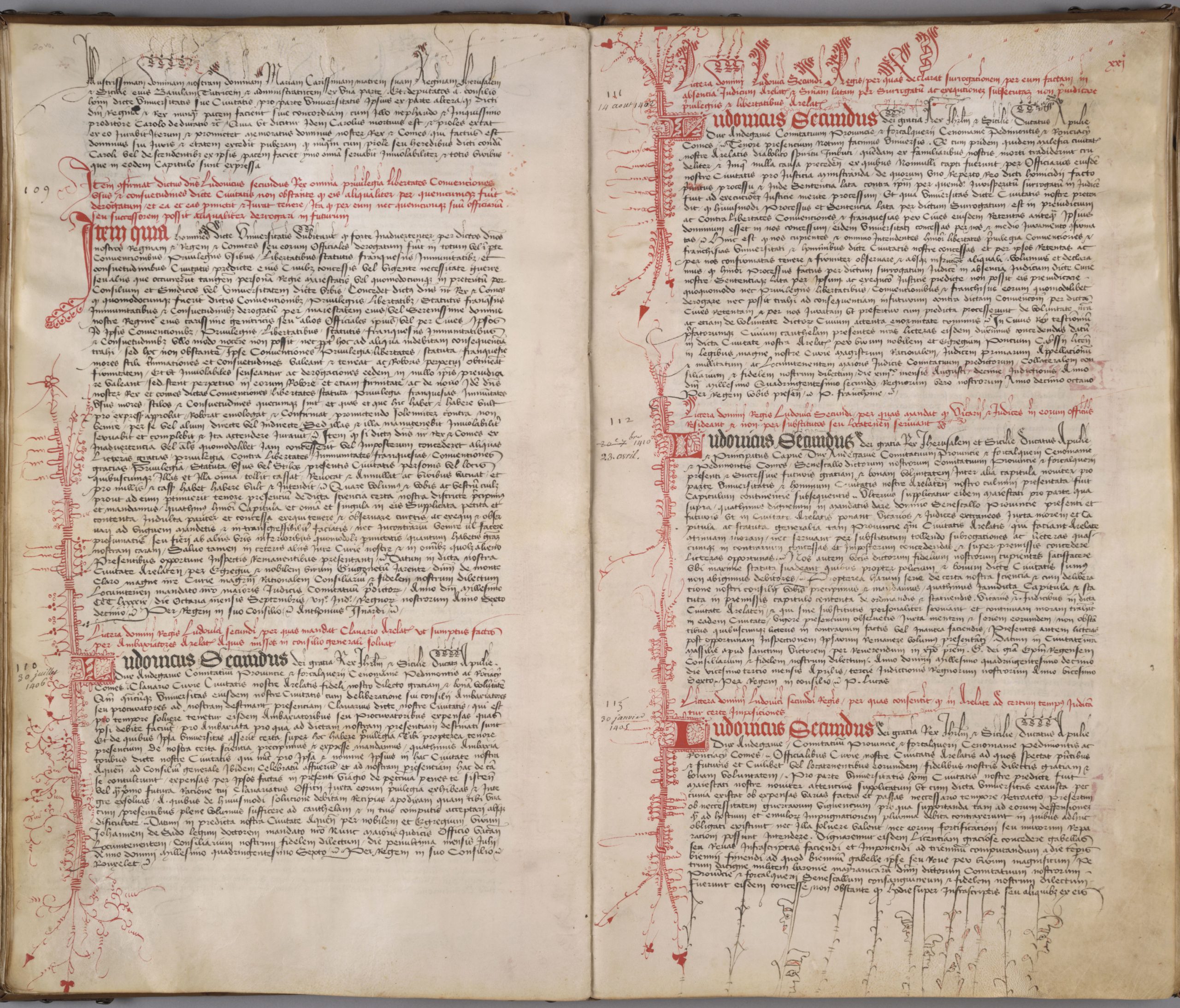 AA7 folios 20 verso et 21 recto : Lettres du comte de Provence Louis II (1384-1417) datant de la période 1402-1410 qui montrent la profusion du décor, notamment à droite dans la marge du bas les nombreux grotesques accrochés aux hampes des lettres