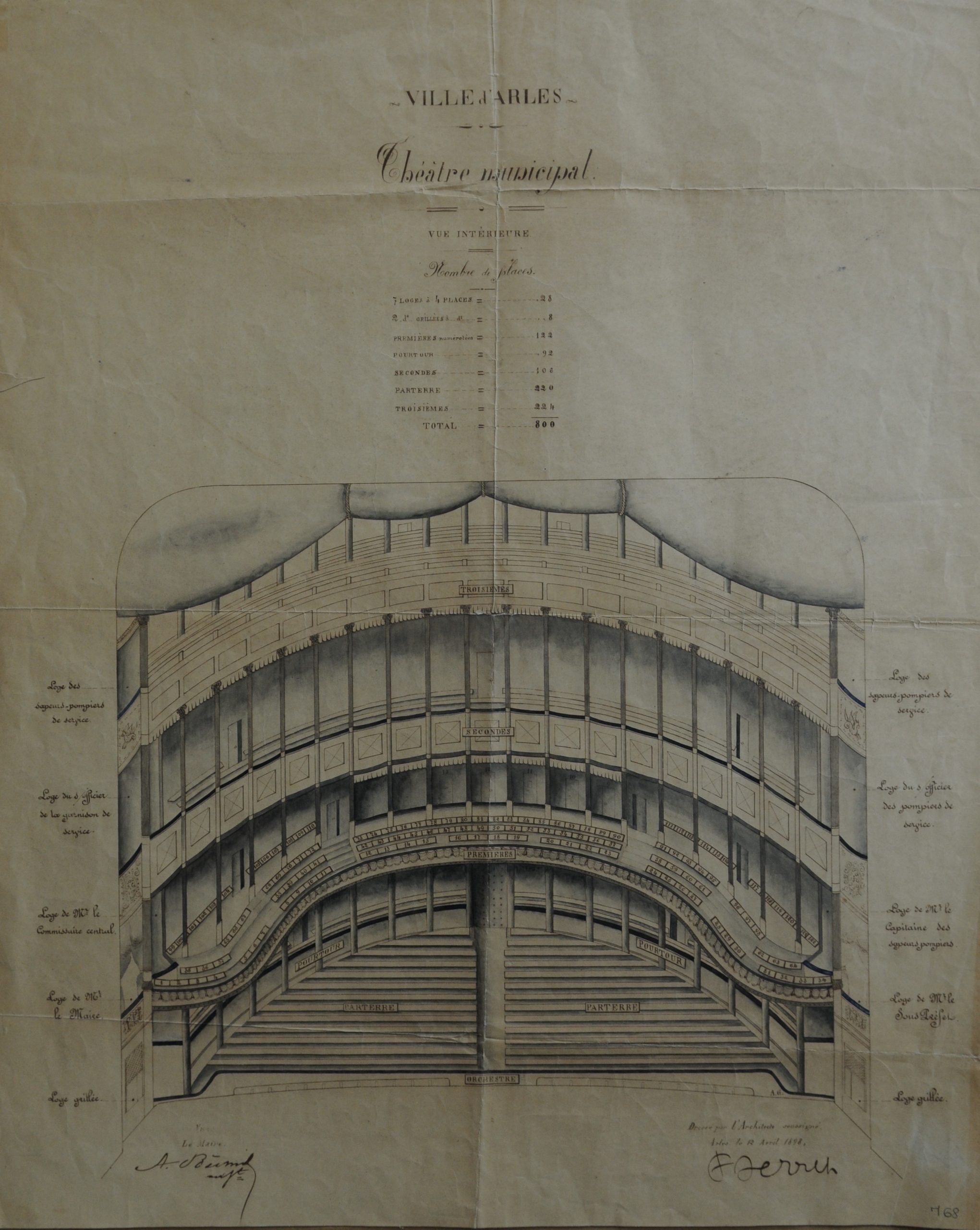 Le 18 février 1828 le Maire prit l’initiative de trouver un architecte pour la construction du théâtre. Au printemps 1828, Alphonse Henri de Gisors (1796 – 1861) fit parvenir le programme architectural dont seuls les plans et le devis sont conservés aux archives d’Arles. Bien qu’en 1830 ce projet ait été accepté par l’État, la construction dut s’arrêter et il fut abandonné.
