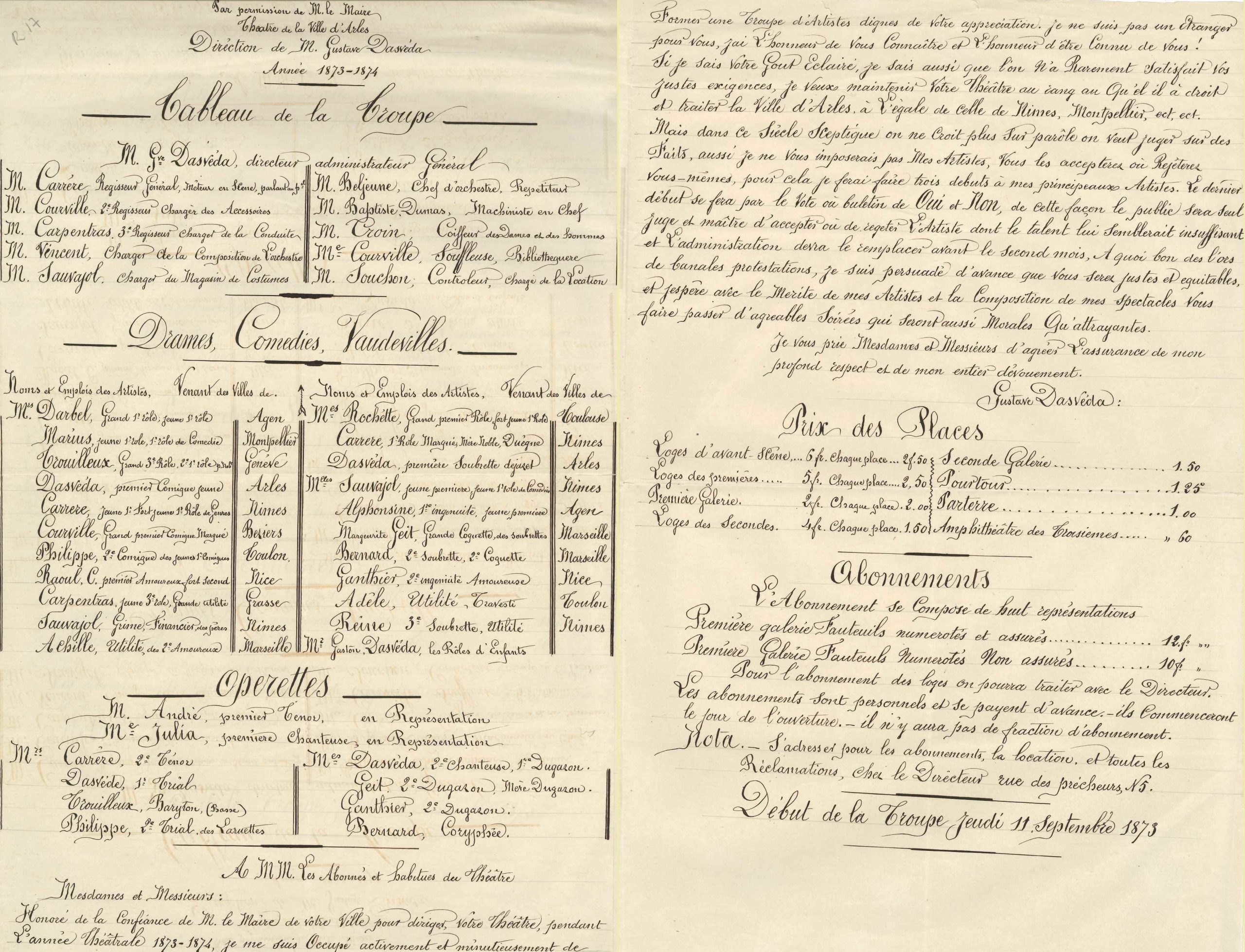 Les archives d’Arles proposent un atelier sur le théâtre « Si le théâtre m’était conté », en une ou deux séances, à destination des collèges (4e, programme de littérature et société, enseignement d’exploration) et lycées (2d générale ou technologique, 1ère histoire).