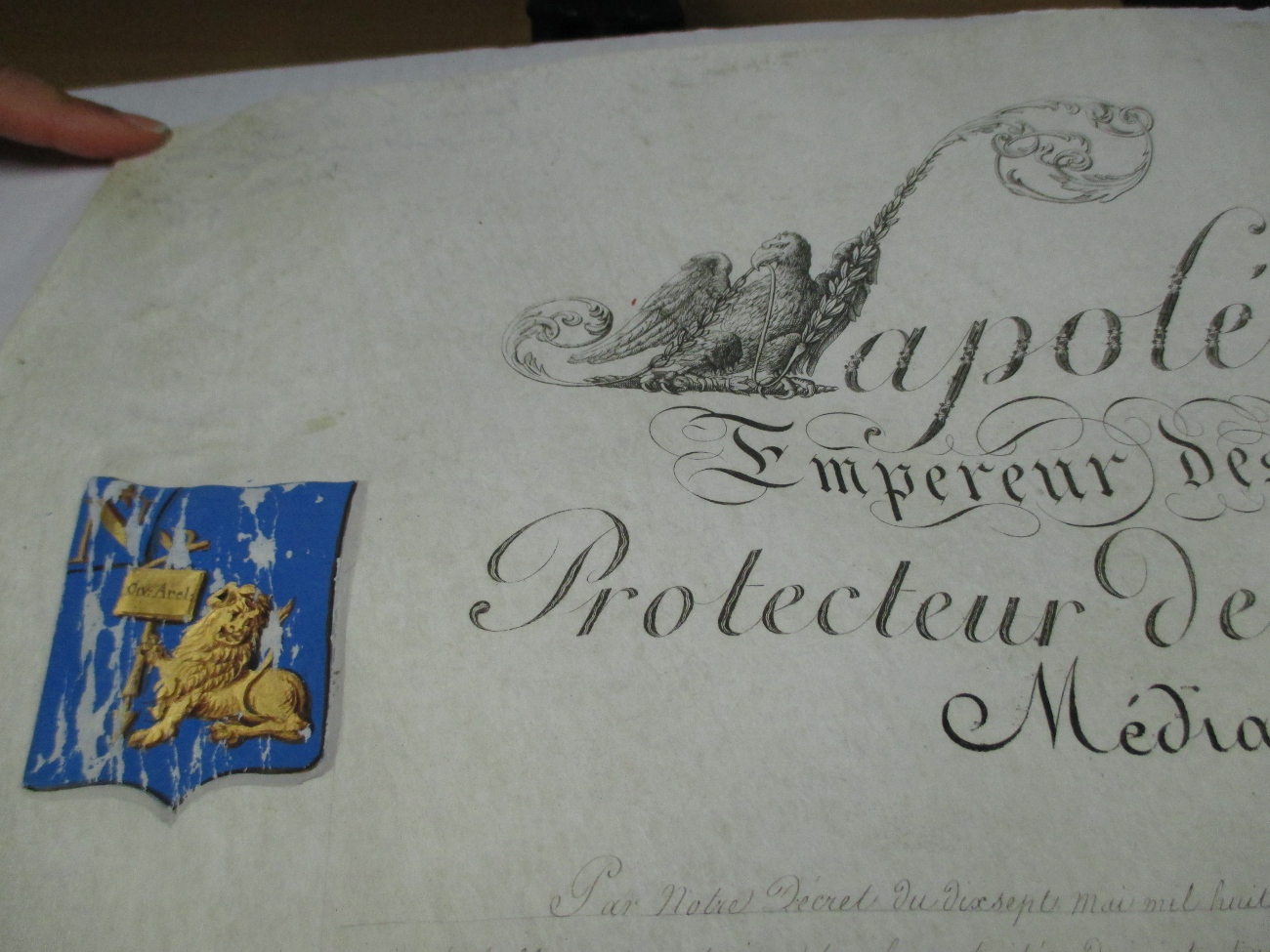 Sur la charte en elle même, on remarque un N noyé dans l’aigle, symbole de Napoléon 1er et de l’empire qui commence la phrase : « Napoléon par la grâce de Dieu empereur des français roi d’Italie protecteur de la confédération du Rhin médiateur de la confédération suisse à tous présents et à venir Salut »