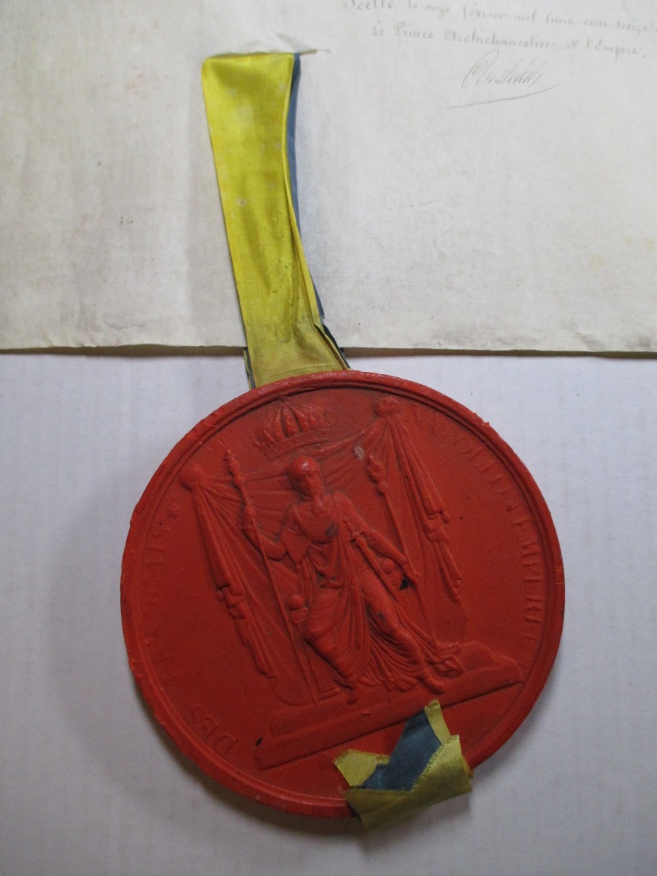 Le sceau pendant de la charte porte également les symboles de l’Empire : Napoléon 1er apparaît sur son trône, tenant le sceptre (bâton de commandement et signe d’autorité) dans la main droite, la main de justice de la main gauche ; il est surmonté d’une couronne fermée.