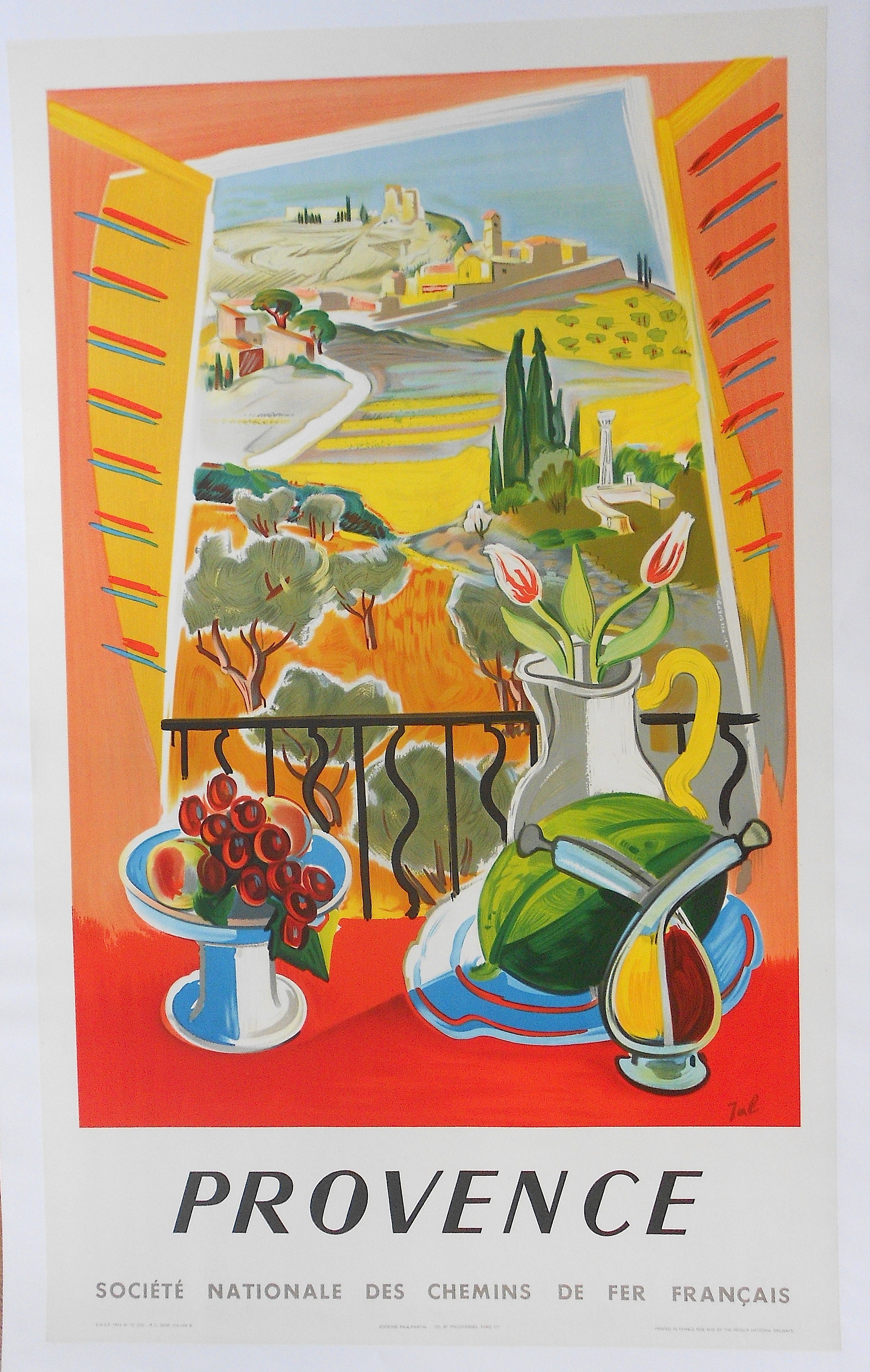 En 1938, les cinq réseaux ferroviaires français les plus importants ont fusionné pour créer la Société Nationale des Chemins de Fer Français (SNCF). La SNCF met en place une campagne de promotion mettant en avant de nombreuses destinations desservies par le train. Pour cela, elle sollicite des artistes français dont les œuvres seront publiées sous forme d’affiches. L’affiche présentée met en avant la Provence, c’est une lithographie du peintre Jal. On peut y voir un village perché sur une colline, des couleurs chaudes jaune et orange qui rappellent le soleil provençal, des oliviers et des cyprès, des vestiges romains, des fruits et de l’huile d’olive en bouteille.