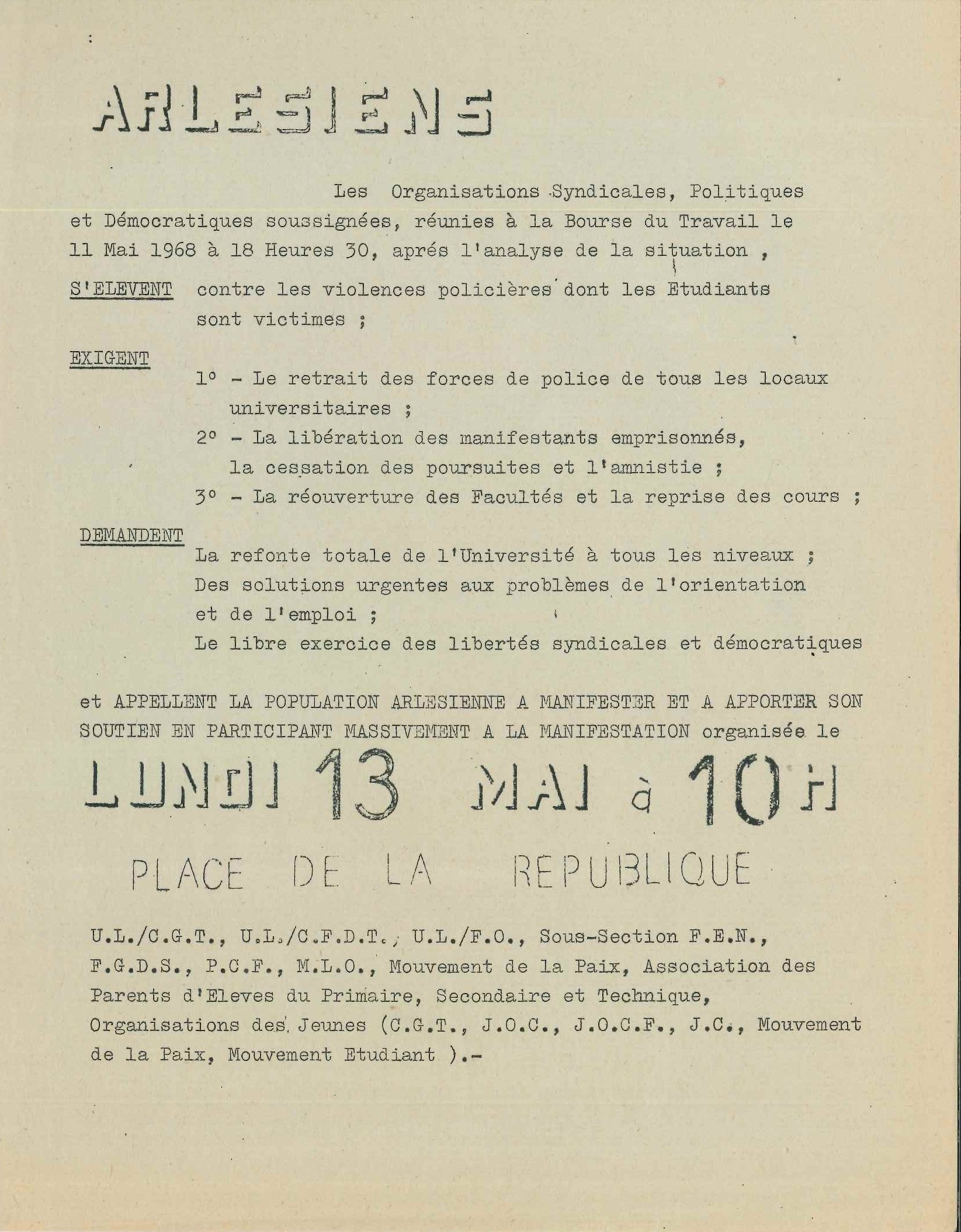 A Arles, une réunion a lieu le samedi 11 mai à la Bourse du travail dont le thème principal est le « problème étudiant » et le mécontentement face à l’attitude du gouvernement à laquelle participent le parti communiste et de nombreux mouvements syndicaux : CGT, CFDT, MLO (Mouvement de Libération Ouvrière), Mouvement de la paix et associations de parents d’élèves.