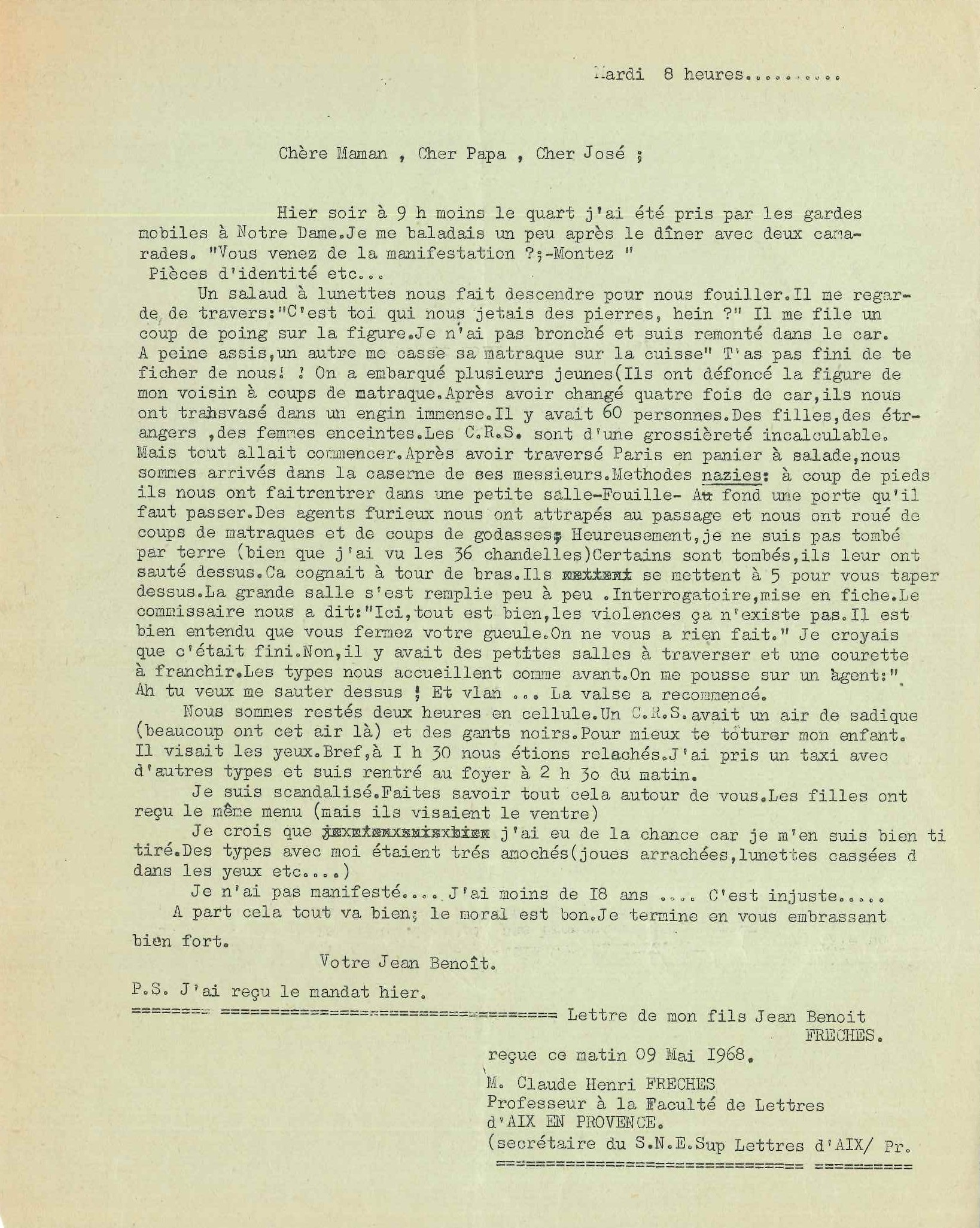 Lettre de Jean Benoit Frèches lue lors de la manifestation du 13 mai 1968 sur la place de la République à Arles (Archives Communales d’Arles, 32S291)