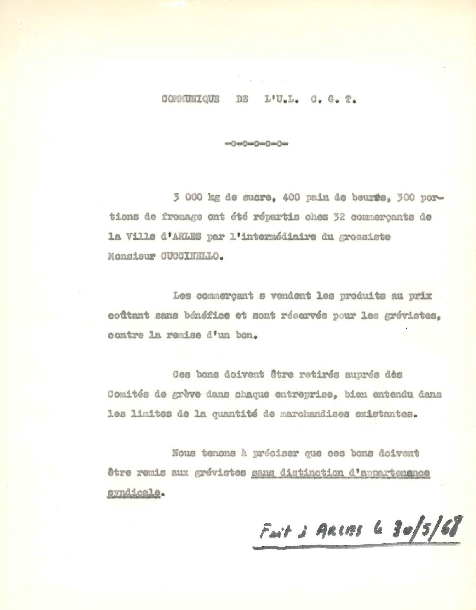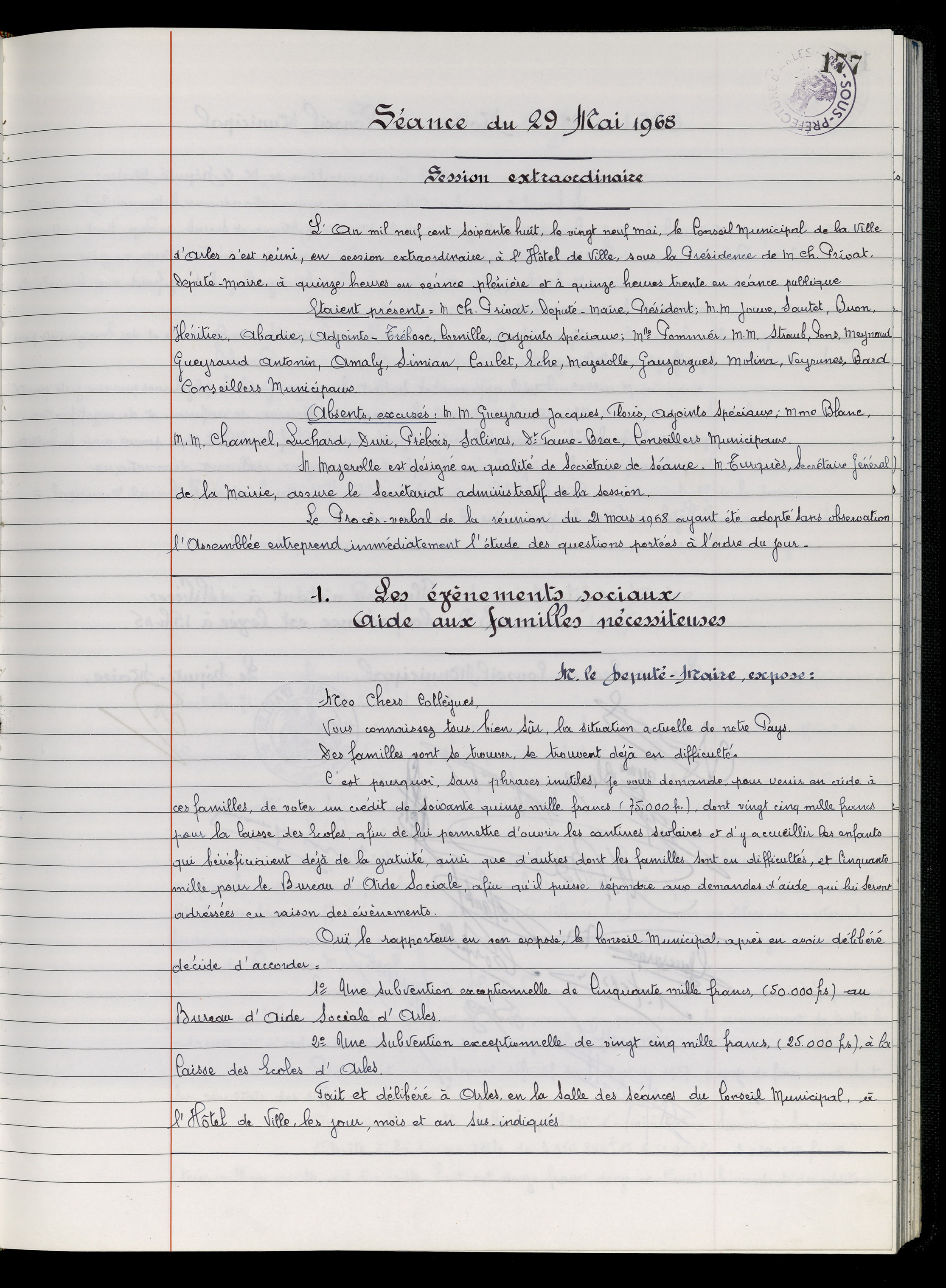 Lors de la séance extraordinaire du conseil municipal du mercredi 29 mai 1968, le député-maire Charles Privat demande de voter un crédit de 75 000 francs pour venir en aide aux Arlésiens victimes des pénuries liées aux grèves.