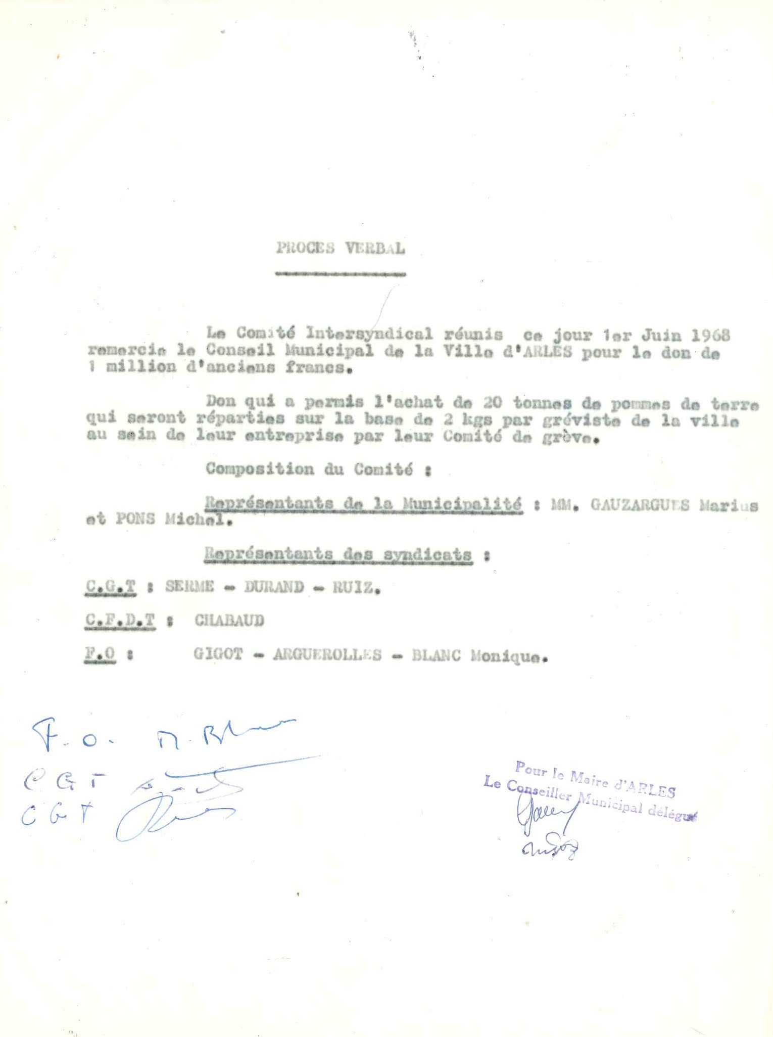 Procès-Verbal du comité intersyndical du 1er juin 1968 remerciant la municipalité de son soutien (Archives Communales d’Arles, 32S291)