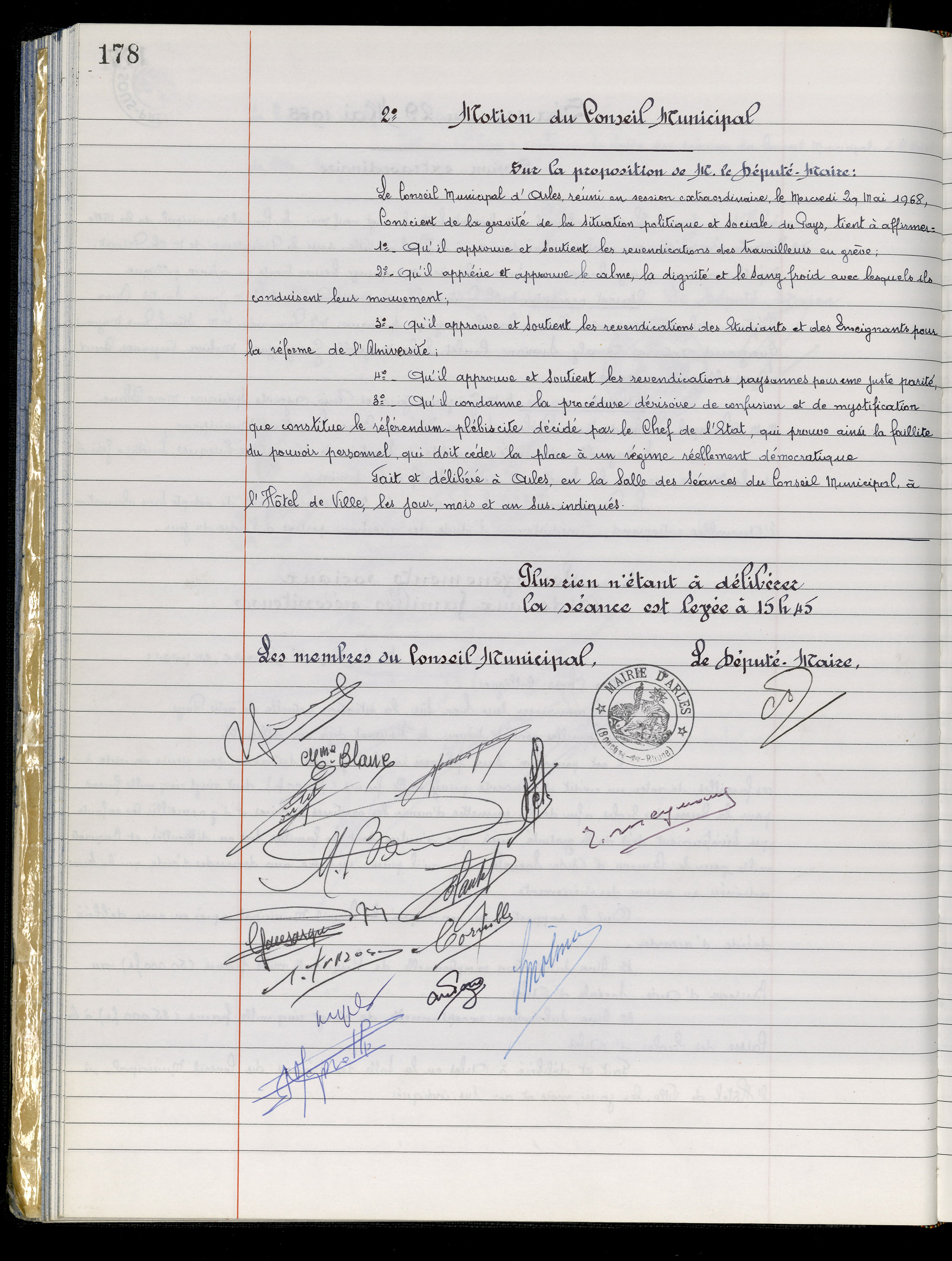 Lors de cette séance, le conseil municipal « conscient de la gravité de la situation politique et sociale du pays » approuve les revendications des travailleurs en grève et celles des étudiants et des enseignants pour la réforme de l’université.