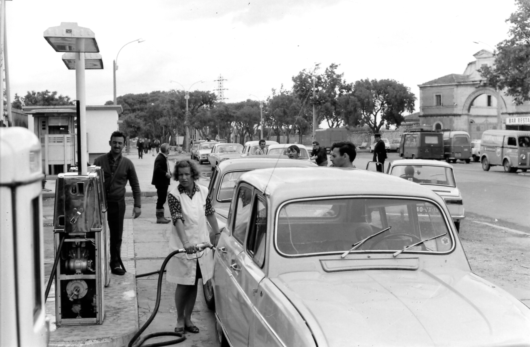 Une longue file d’attente, surveillée par la police, devant le poste à essence de Maurice Jauffret (sur la photo) avenue Victor Hugo. Photo Charles Farine