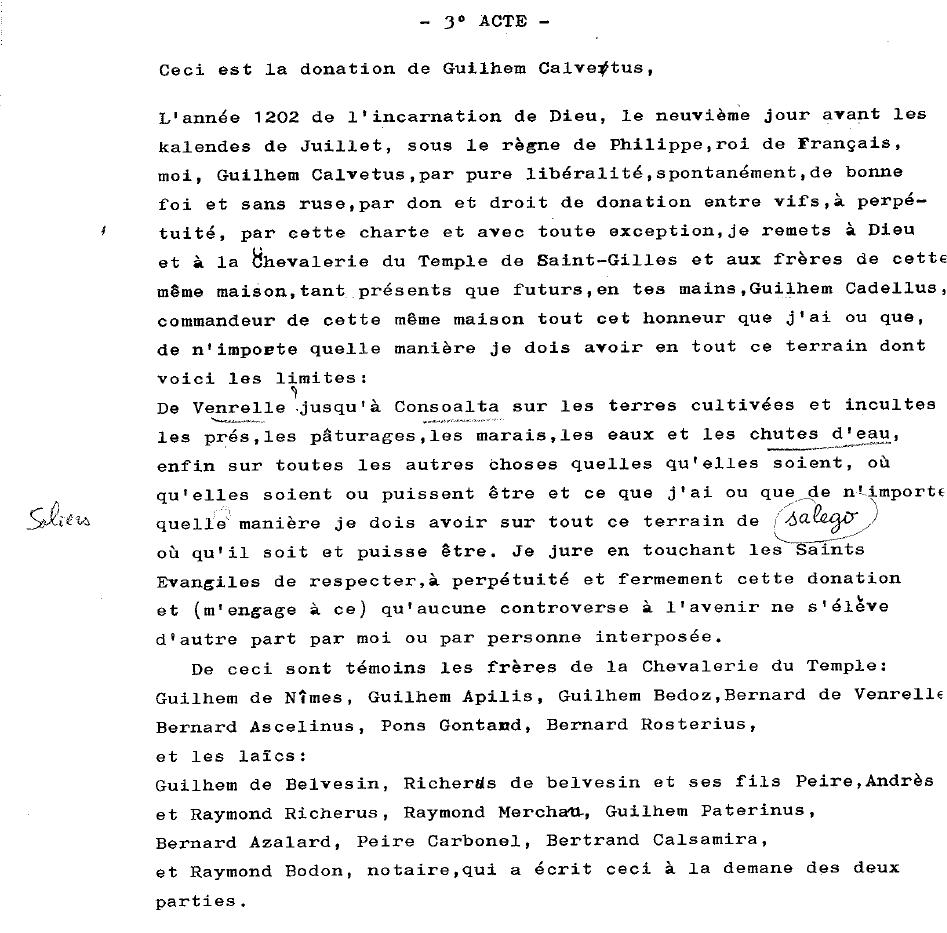 Cette donation intervient en 1202, alors que Philippe Auguste est roi de France. Elle participe de l’extension des possessions de l’Ordre des Templiers de la commanderie de Saint-Gilles. Les moines-soldats sous l’autorité du commandeur reçoivent des terres, ceci participe à l’extension de leur réseau foncier et religieux. Cette donation est faite par un laïc Guilhem Calvetus en présence du commandeur Guilhem Cadellus, des frères de la chevalerie du Temple, de laïcs et d’un notaire qui authentifie l’acte.